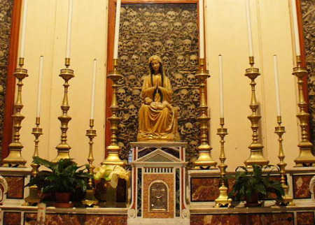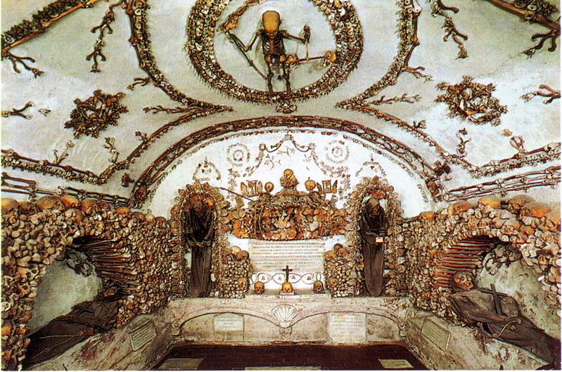 Hundreds of skulls have been put up around this alter with a crucifix. This place is a Vatican approved chapel.