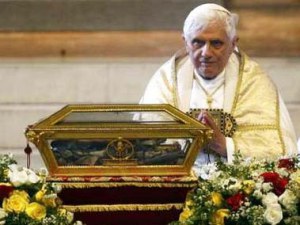 The present Pope only adores one skeleton at the time. This picture was taken during the Pontiffs visit to the Church which has kept the bones of St. Augustine for “veneration”.