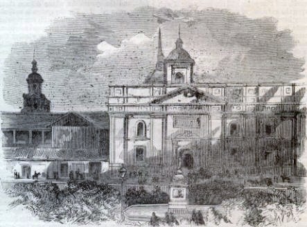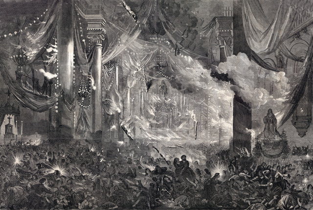 "At a little before seven the assistants began lighting up the church, and were just finishing the grand altar, the rest of the building being fully illuminated with thousands of lamps, most of them of parafine oil, when from a transparent cresent, at the foot of the statue of the Virgin, burst forth a jet of flame. The attendant endeavored to extinguish it with his poncho, but the inflamable liquid penetrated the fabric and only increased the danger. In a moment the flames darted up the garlands of artificial flowers to the roof, the immense cupola caught fire, and the lamps suspended from the roof by strings dropped and exploded among the densely packed mass of women kneeling beneath. Darting along the wooden ceiling, already heated to the dryness of tinder, the flames ran like hissing serpents the whole length of the church, and rolled down in huge billows upon the compact crowd that had instinctively sought the main entrance. During the first few moments of surprise and terror, shrieks of sorrow for the destruction of their beloved church resounded through the aisles of the building; but, when rushing to the various outlets, all were found closed save one, and that one impassable, loud screams of horror burst from the despairing multitude.