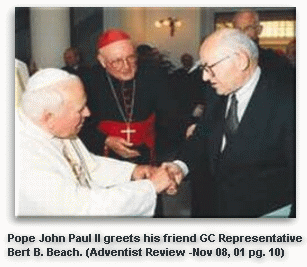 Now we have B.B. Beach in 2001, standing in the Devil's throne room, clasping the hand of The Devil's Vicar and declaring him to be the "friend" of Seventh Day Adventists!