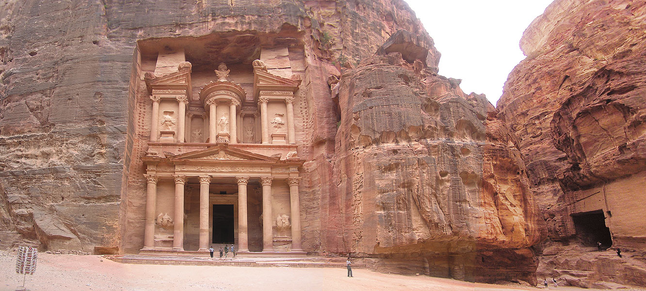 This valley is enclosed by almost, precipitous mountains, varying from two hundred to one thousand feet in height. In the sides of the valley are numerous short ravines, which terminate abruptly in the surrounding mountains, making the whole circuit about four miles. The main entrance to the city is from the east, through a ravine, which in some places is no more than twelve feet wide, while its sides rise two hundred feet high. Facing this ravine is the most beautiful structure of Petra, a temple, hewn out of the face of the opposite cliff. Further to the west, and high up in a ravine, stands another temple, also hewn out of the solid rock. Its front is one hundred and fifty-two feet in height and width. Travelers who have visited Petra, tell us that these buildings have a striking appearance, as the hewn and polished rocks are of many bright colors, blending with each other; while the cliffs above in their rude state add to the beauty of the scene by the contrast.