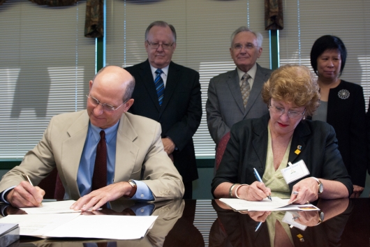 Adventist Church President Ted N. C. Wilson and Pan American Health Director Mirta Roses Periago sign a memorandum of understanding that will formalize collaboration as the two organizations continue public health initiatives. The signing ceremony took place Tuesday, July 26 in the executive conference room at the Adventist Church's world headquarters. [photo: Ansel Oliver]